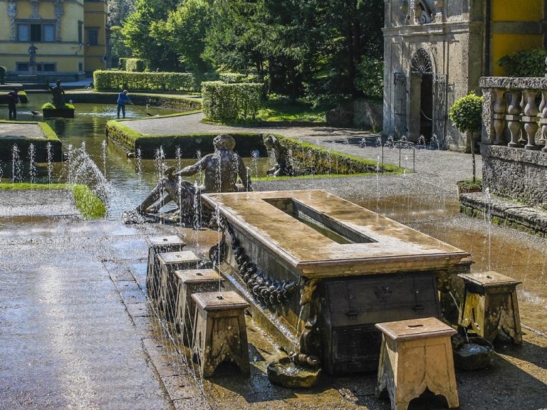 "Man weiß nie ganz genau, was einen in Hellbrunn erwartet. Aber eines ist sicher: langweilig wird es nie! Wasserautomaten, Grotten und heimtückische Spritzbrunnen sorgen seit über 400 Jahren für nasse, vor allem aber lachende Gesichter." - beschreiben sich die Wasserspiele in Hellbrunn.